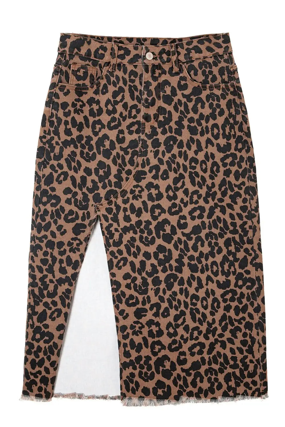 Brown Leopard Frayed Split Denim Midi Skirt With Pockets Gilded Glamour Shop