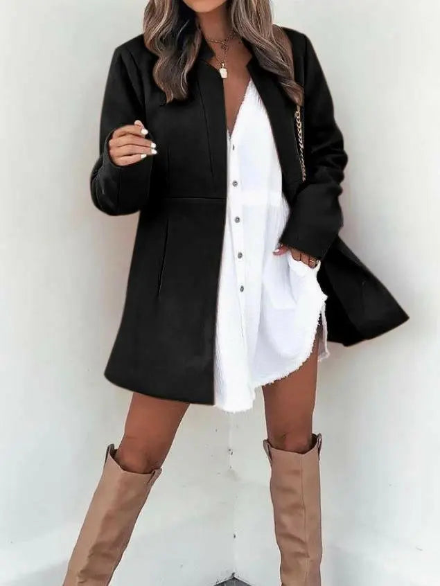 Solid Color Long Sleeve Pocket Woolen Women's Coat - Plush Fashion Hub