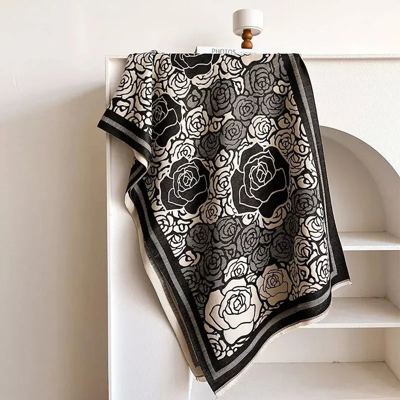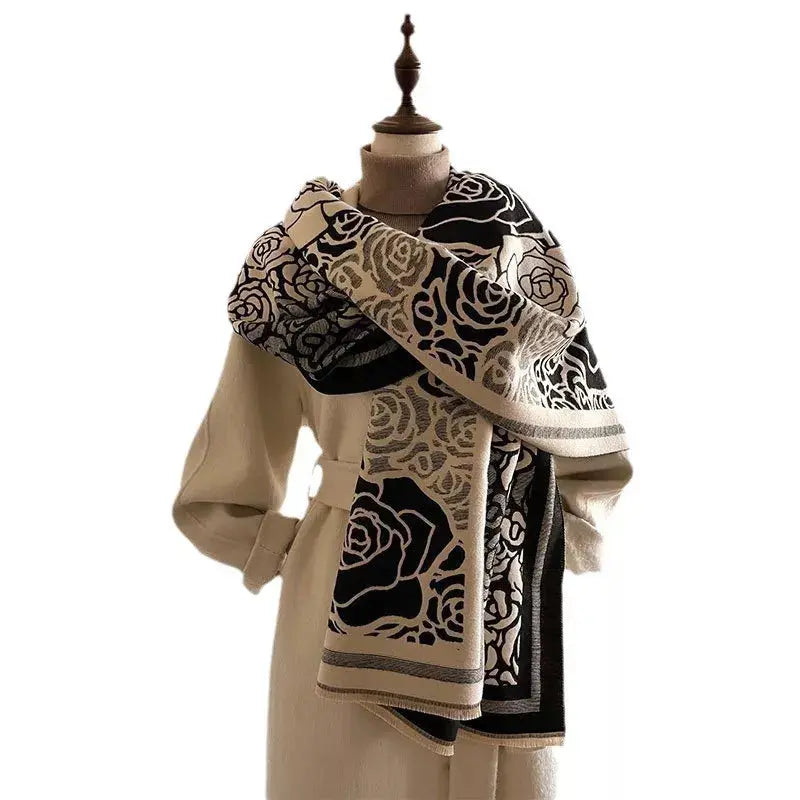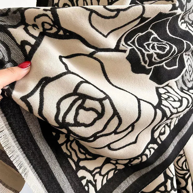 Elevate your winter wardrobe with this exquisitely crafted rose-patterned scarf featuring a sophisticated raw hem finish. The delicate floral motif adds feminine charm to any ensemble, while the generous 70.9-inch length offers versatile styling options—drape it loosely for effortless elegance or wrap it snugly for cozy warmth.