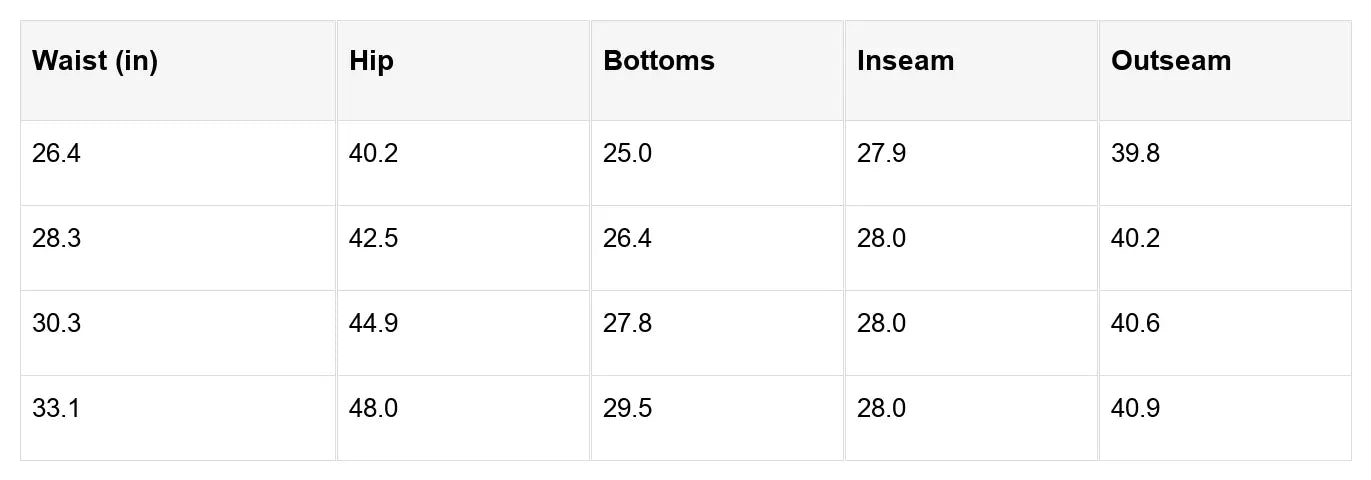 | Size | US | UK | EU | Waist (inches) | Hips (inches) |