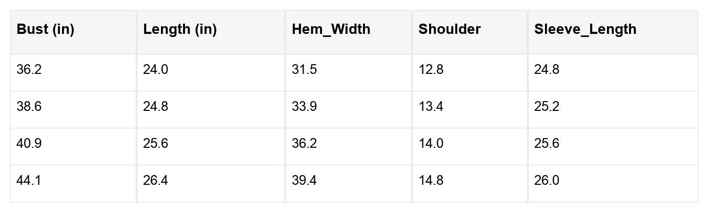 | Size | US | UK | EU | Bust (inches) | Waist (inches) | Hips (inches) |