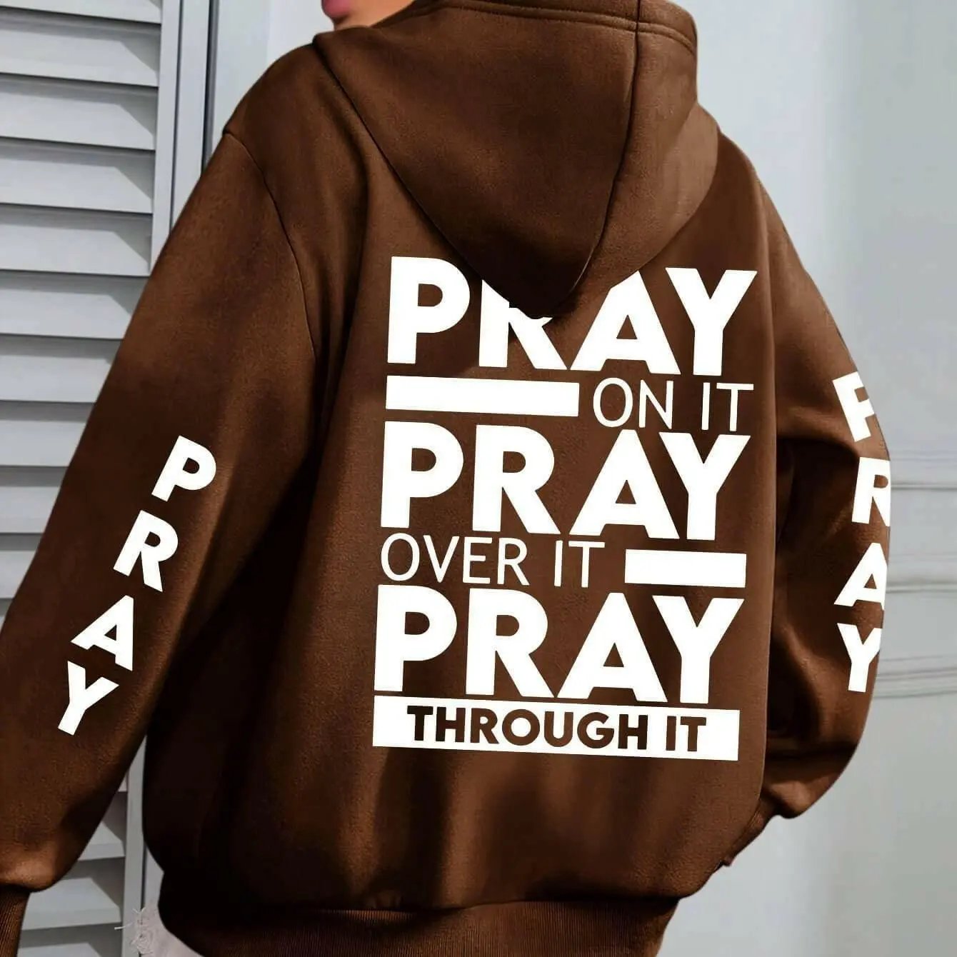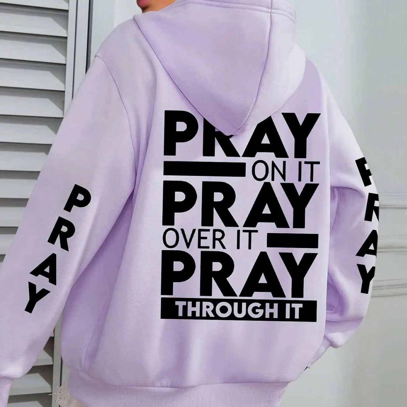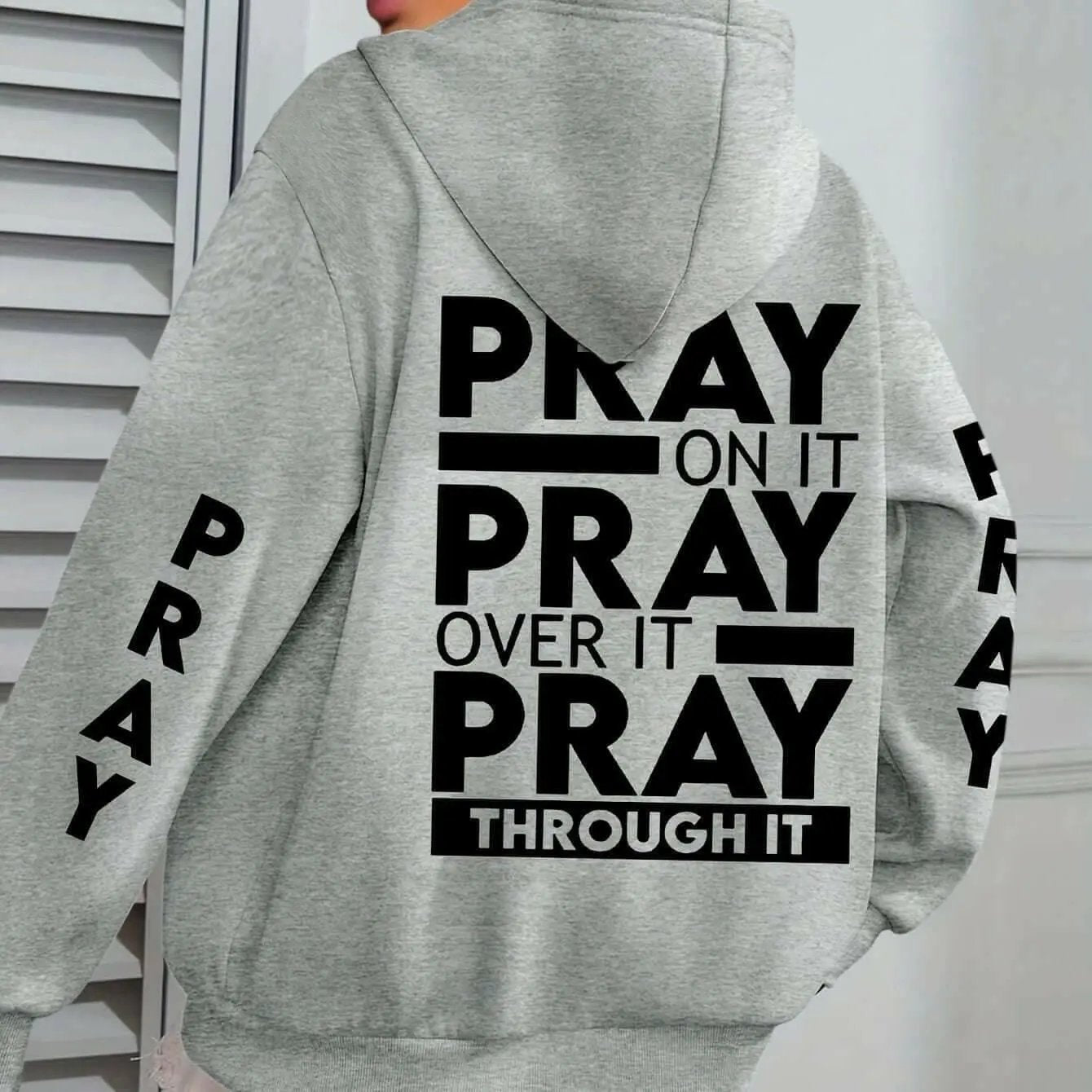 Embrace the sophistication and exclusivity of the PRAY Print Plus Size Kangaroo Pocket Hoodie—your new favorite for making a statement in every season.