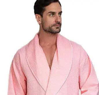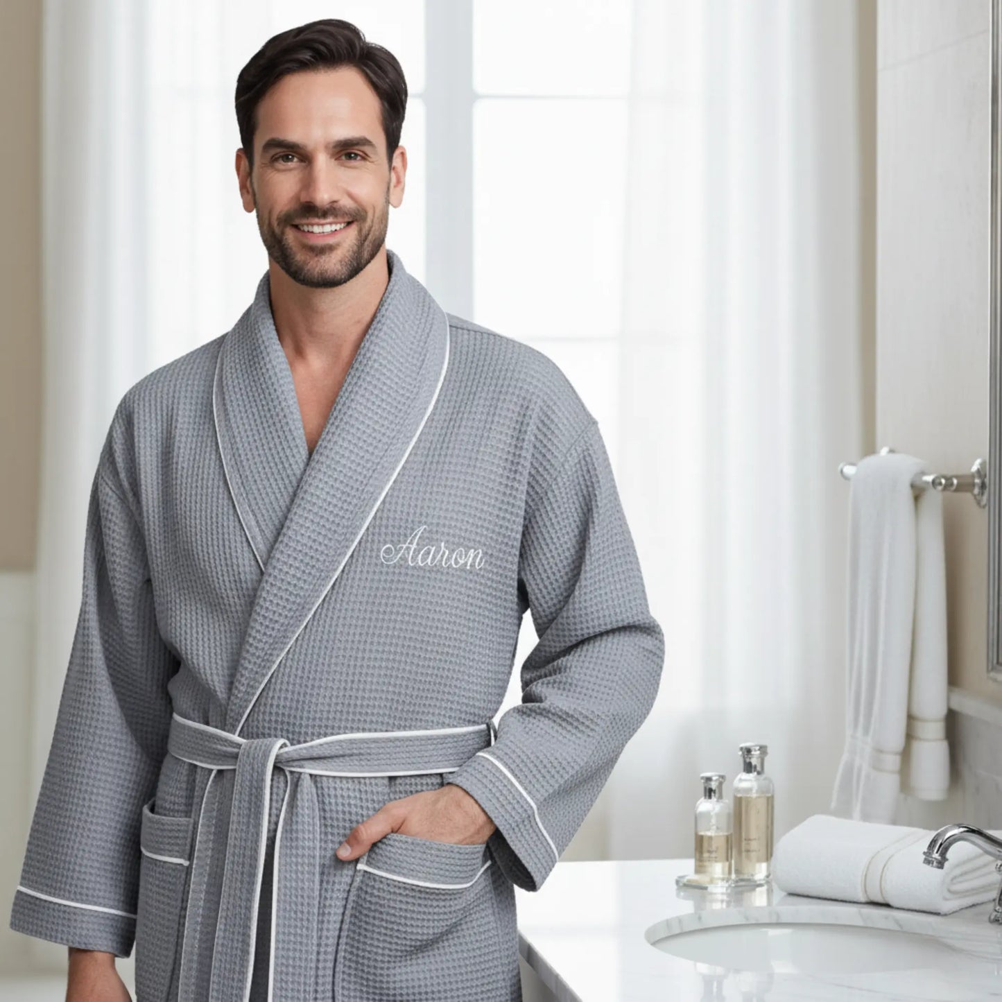 The waffle piping robe for men adapts to your body temperature and movement, making it the perfect post-shower, spa-day, or recovery-day layer.