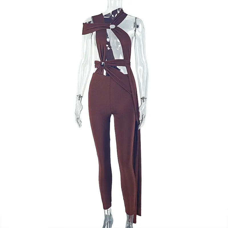 Sexy Women Streetwear Lace up Cutout Metal Ring Jumpsuit Solid Color Skinny Pants Long Jumpsuit Bella Mia