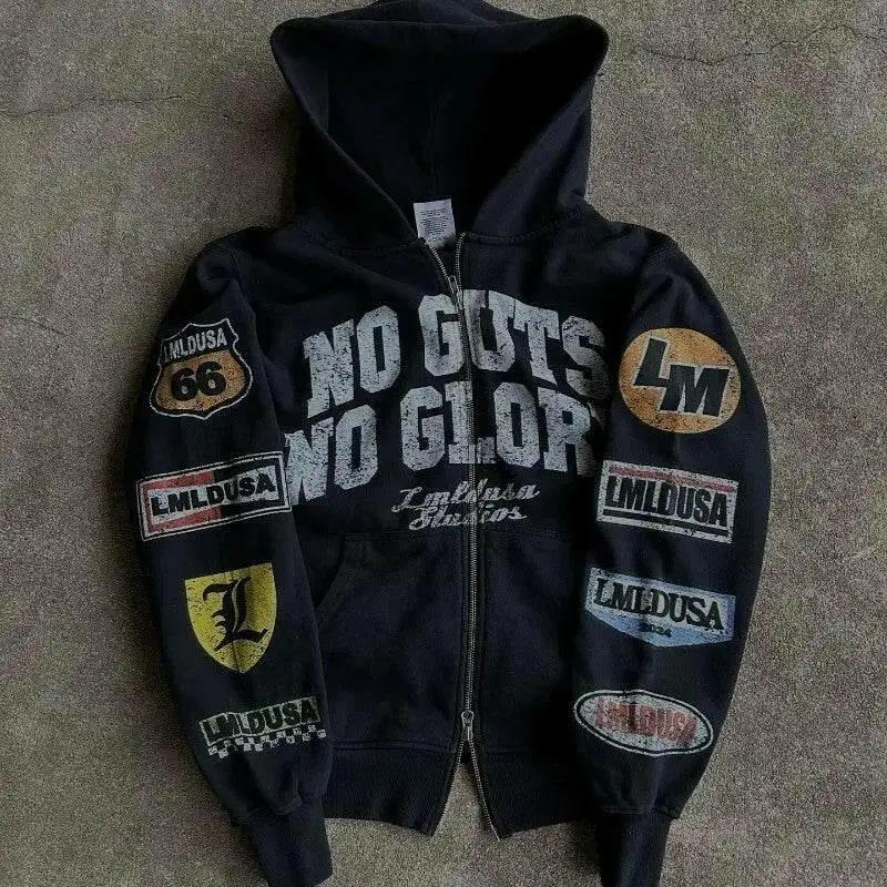 Street Hip-hop Vintage Printed Black Zipper Hooded Sweatshirt.