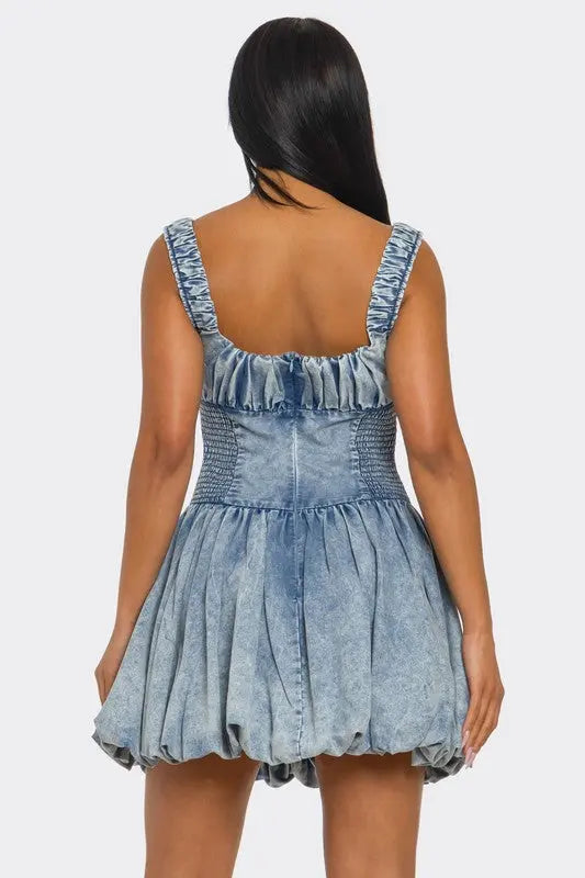 The star of the show? A voluminous bubble hem skirt that creates a sculptural silhouette and adds movement to every step. Feminine, bold, and totally unexpected-this is the kind of dress that turns casual denim into a showstopper. Style with heels or boots for a night-out look that stands out.