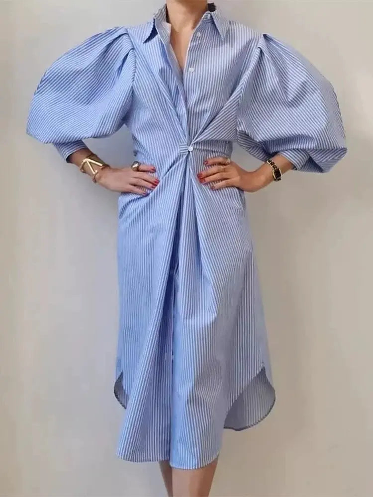 Elevate your wardrobe with this sophisticated striped shirt dress featuring irregular lantern sleeves. Its unique sleeve design adds a modern twist to the classic striped pattern, offering both style and comfort. Perfect for day-to-night wear, this dress effortlessly combines elegance with a contemporary edge.