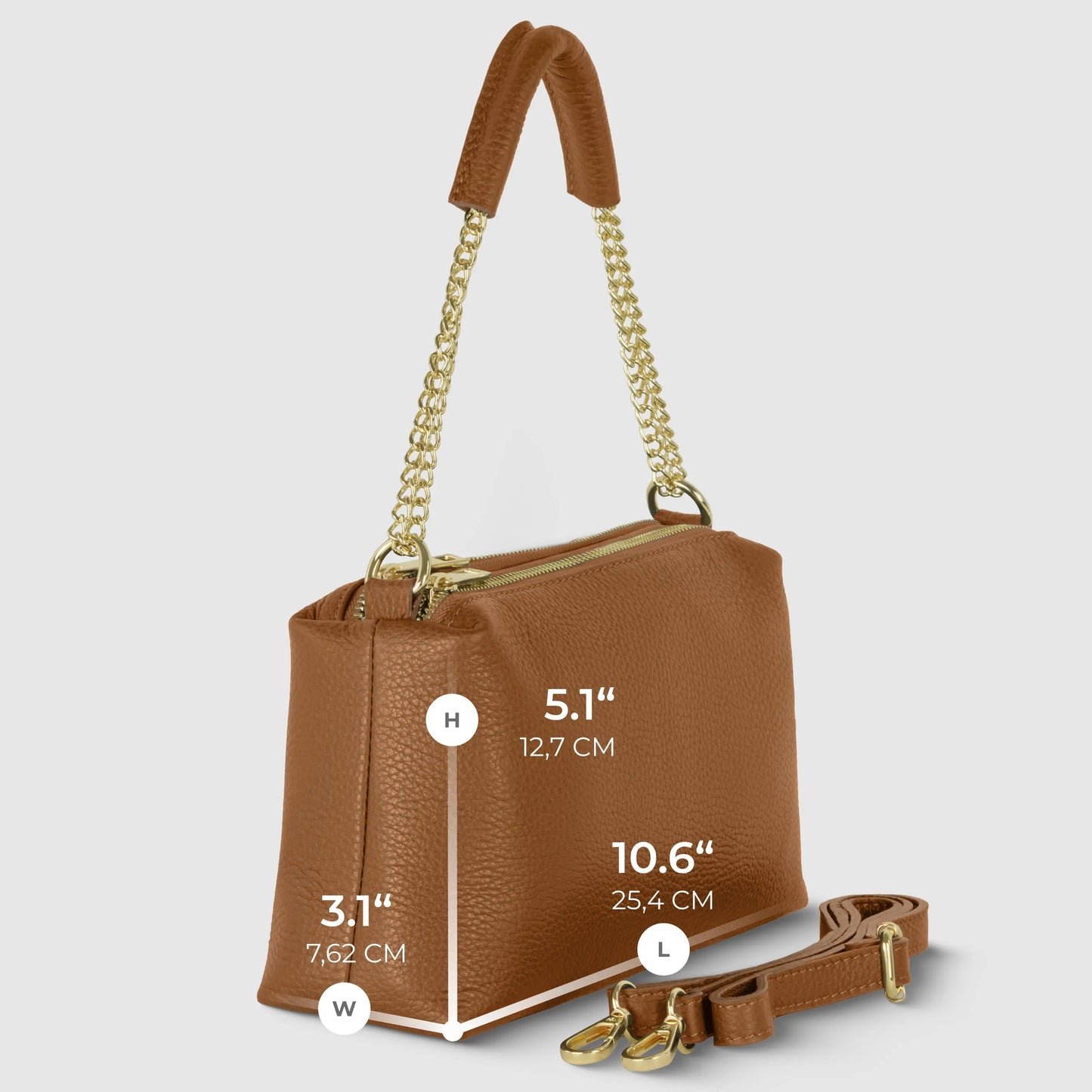 The base handle features a double metal chain with a wide leather pad for comfort. A detachable long strap in matching leather lets you wear the bag on the shoulder or crossbody — flexible for your lifestyle.
