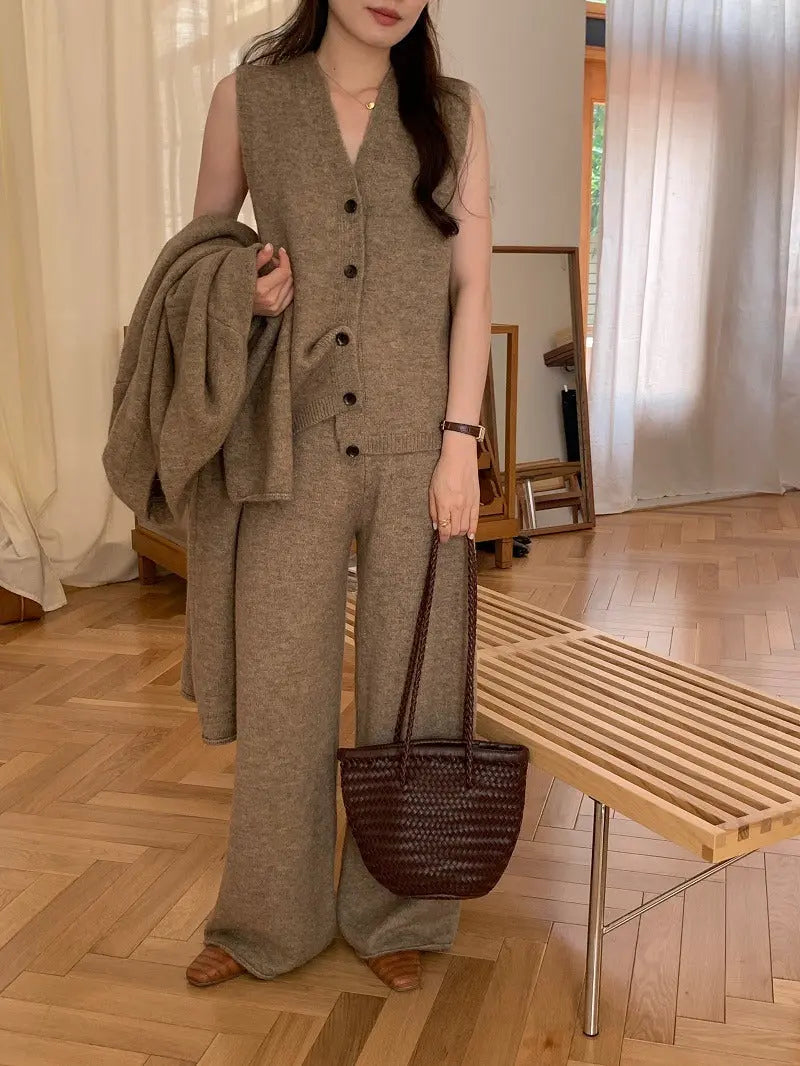 This versatile casual knitted three-piece suit combines contemporary comfort with sophisticated styling. Featuring a long knitted jacket, coordinating vest, and tailored pants, this complete ensemble offers endless styling possibilities for the modern woman who appreciates effortless elegance.