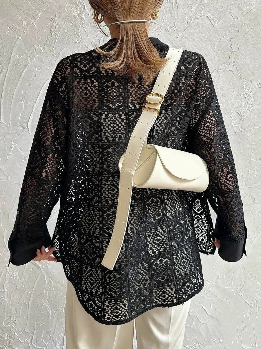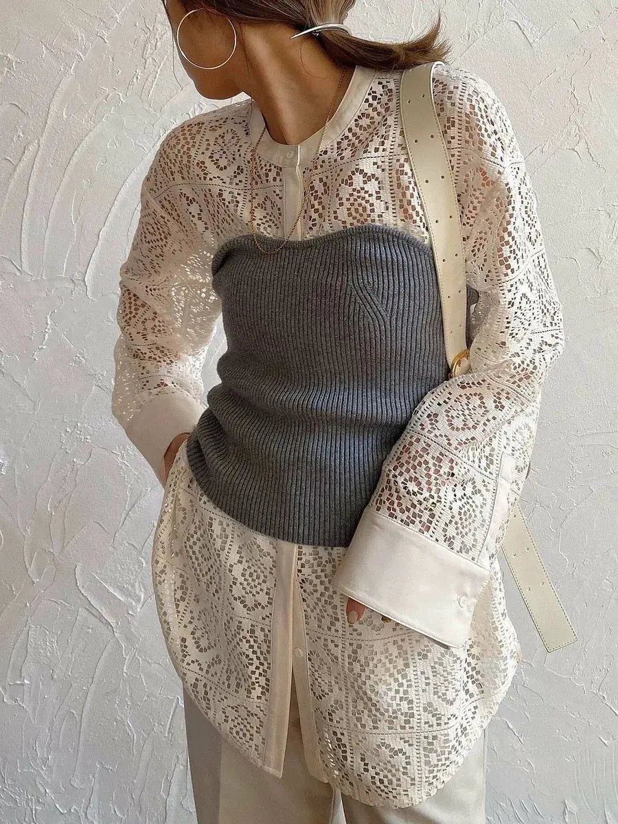 Indulge in sophistication with our Hollow Lace Long Sleeve Shirt. This elegant piece features intricate lace detailing and long sleeves for a refined look. Perfect for any occasion, elevate your wardrobe with this premium shirt.
