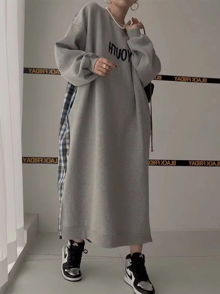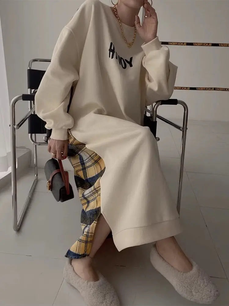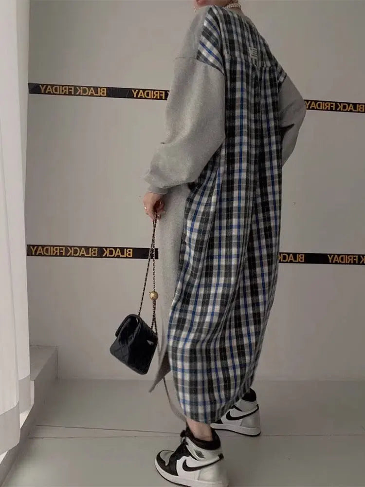 This distinctive letter print patchwork contrast plaid dress combines contemporary graphics with classic plaid patterns for a unique, eye-catching design. Featuring creative patchwork construction and contrasting elements, this maxi dress makes a bold statement while maintaining effortless wearability.