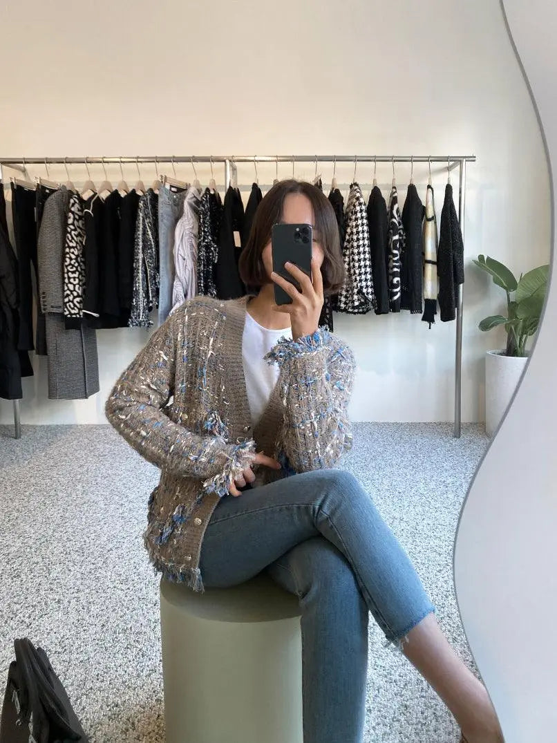 This Vintage V-Neck Fringed Frayed Mélange Knit Cardigan brings artisanal sophistication to your wardrobe. Crafted from a premium cotton-acrylic mélange knit, the frayed fringed V-neckline and elegant tassel details create a timeless piece that transitions effortlessly from casual daily wear to special occasions.