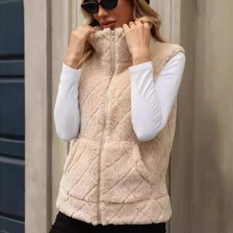 Women Clothing Autumn Winter Cardigan Zipper Loose Diamond Lattice Coat Plush Vest Perfecsy