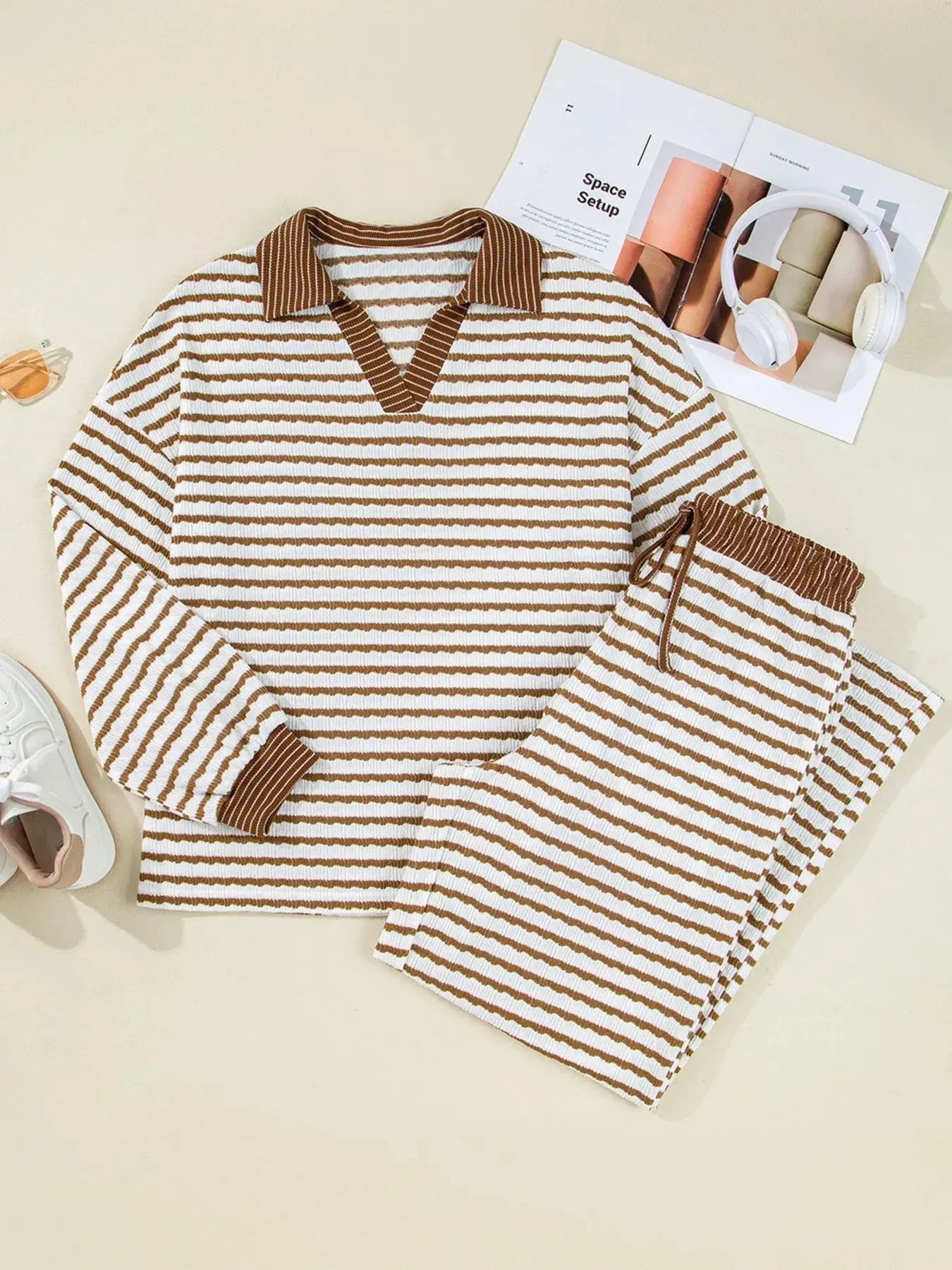 Add a touch of exclusivity and prestige to your closet with the Stripe Collared Top and Drawstring Pant Set, the essential 2 piece pants set for those who seek comfort, value, and modern sophistication in one exceptional package.
